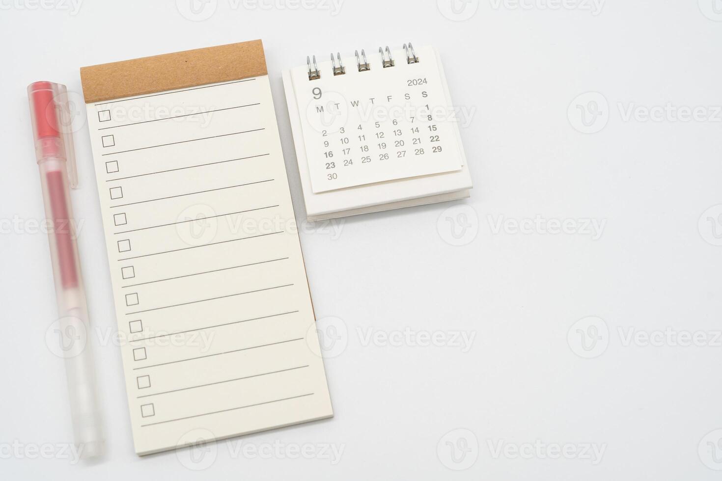 Blank Check list or Empty small notepad with checkbox and Simple desk calendar for SEPTEMBER 2024. Blank checklist for text. Copy Space. Pro Photo