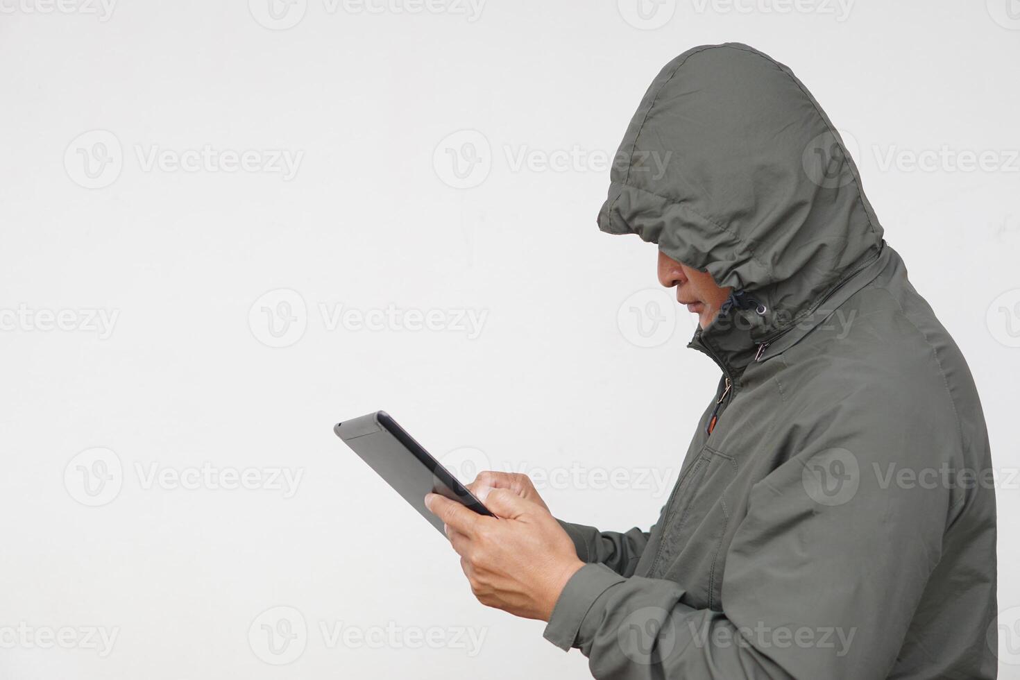 Man hacker wears hoodie, holds smart tablet. Concept, digital information security, Cyber security. Online Criminal. Man is checking and searching information from internet. Pro Photo