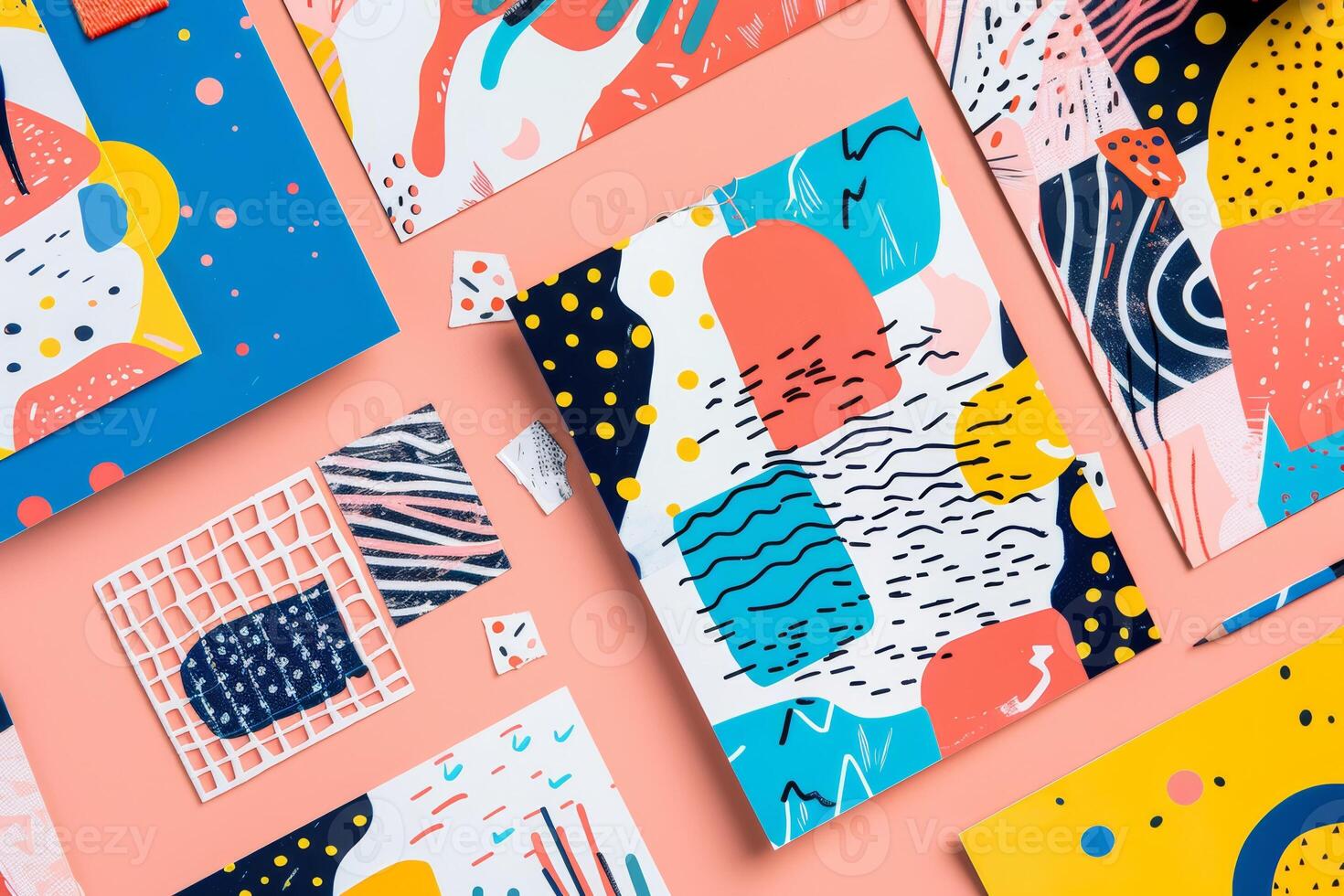 AI generated Colorful abstract stationery collection with vibrant patterns and creative layouts on pink background generative ai Pro Photo
