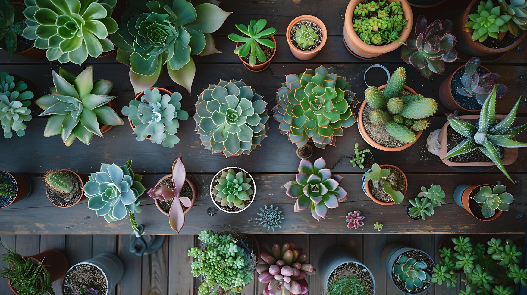AI generated Rustic Table Showcases Array of Potted Succulents and Cacti in Soft Natural Light photo