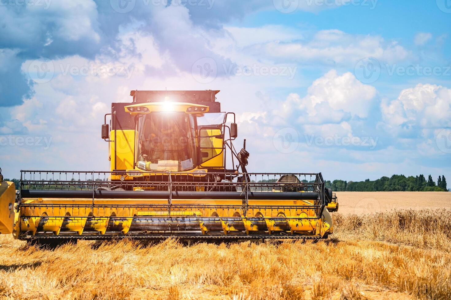 Combine harvester in action on wheat field. Process of gathering ripe crop from the fields. Front view. Pro Photo