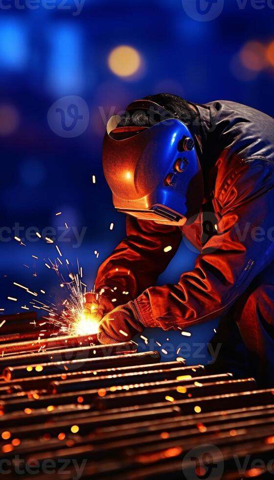 AI generated Close up of professional welding on medium sized pipe with blue light background for text placement Pro Photo