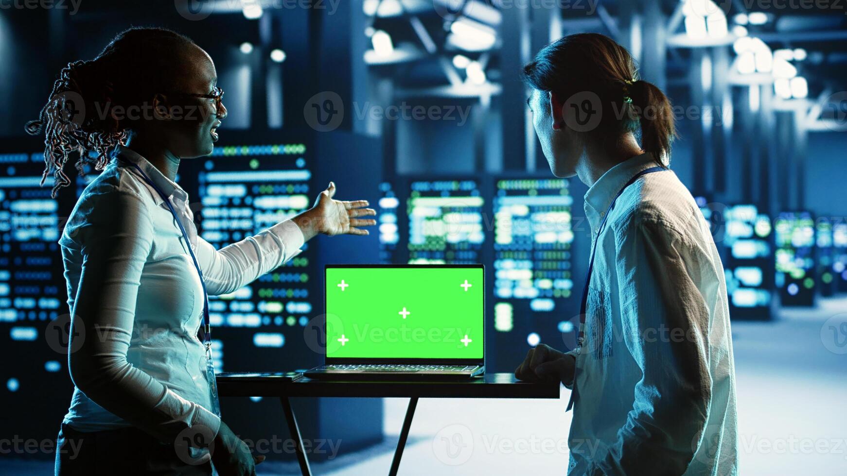 African american admin and colleague using mockup laptop to implement artificial intelligence parallel processing. Experts work on chroma key device enabling AI systems to do machine learning Pro Photo