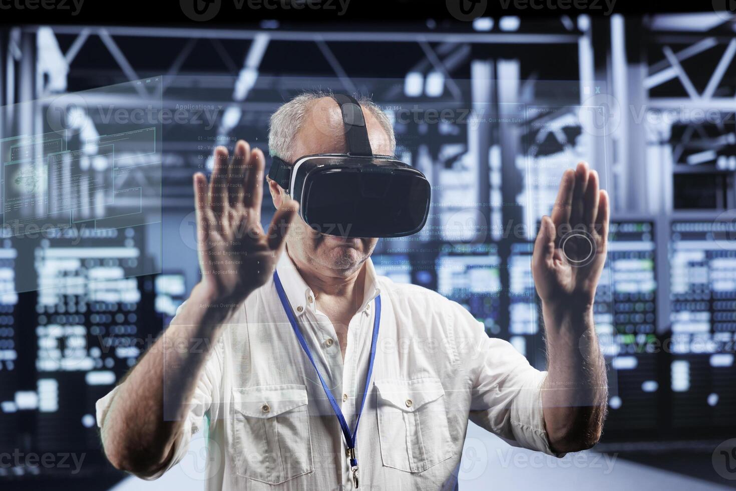 Senescent technical support consultant immersed in virtual reality at data center, doing equipment maintenance. Serviceman using VR headset to optimize server racks performance, checking code lines Pro Photo