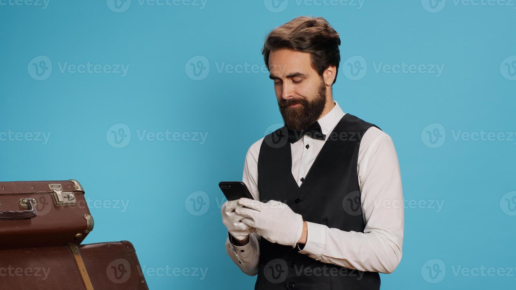 Doorman scrolls social media app on camera, using smartphone to text messages and verify list of bookings. Professional hotel concierge worker uses mobile phone to navigate online web pages. Pro Photo