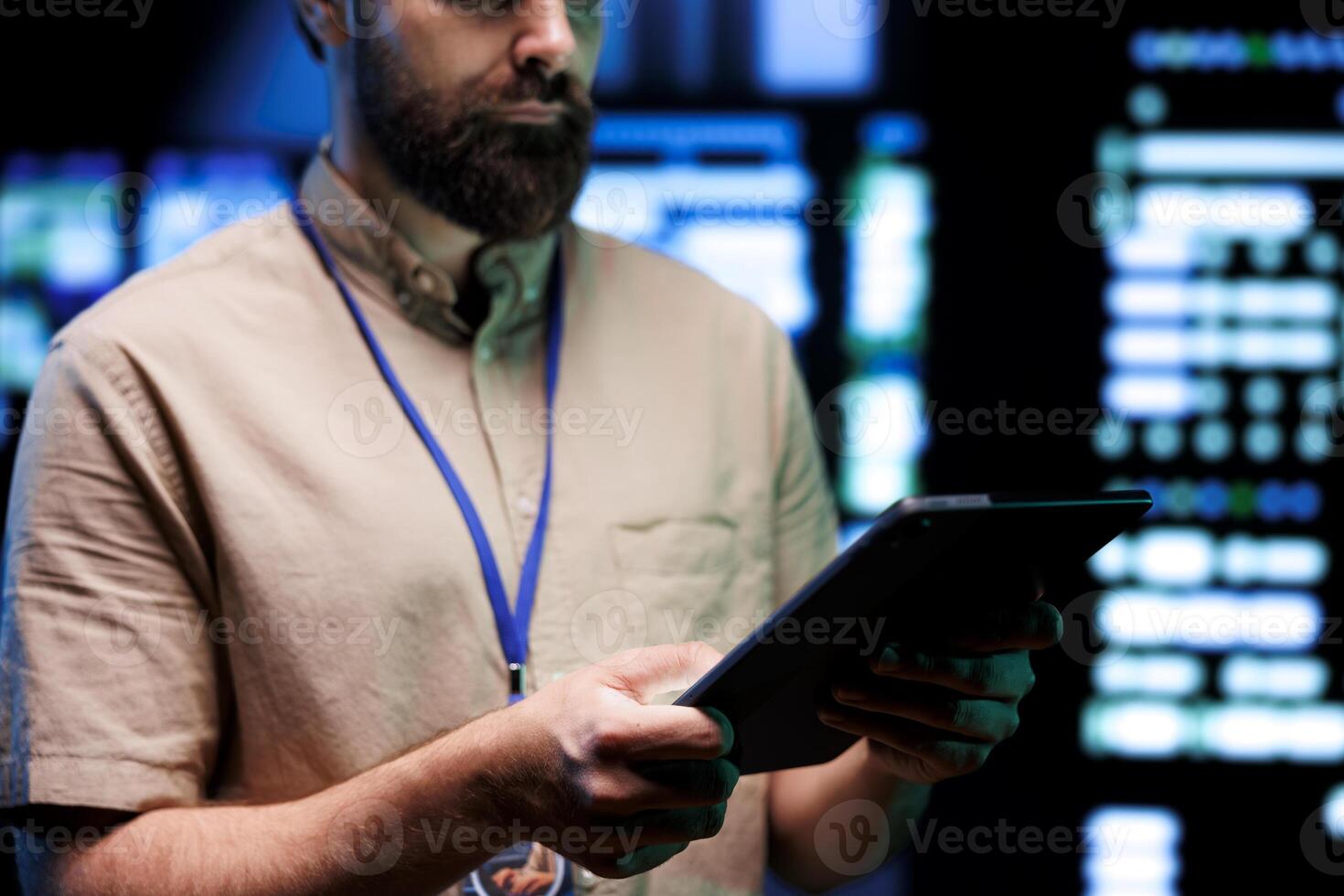 Close up shot of specialist in high tech establishment mending network issues affecting server rows performance and connectivity. Busted facility infrastructure leading to slow data transfer rates Pro Photo
