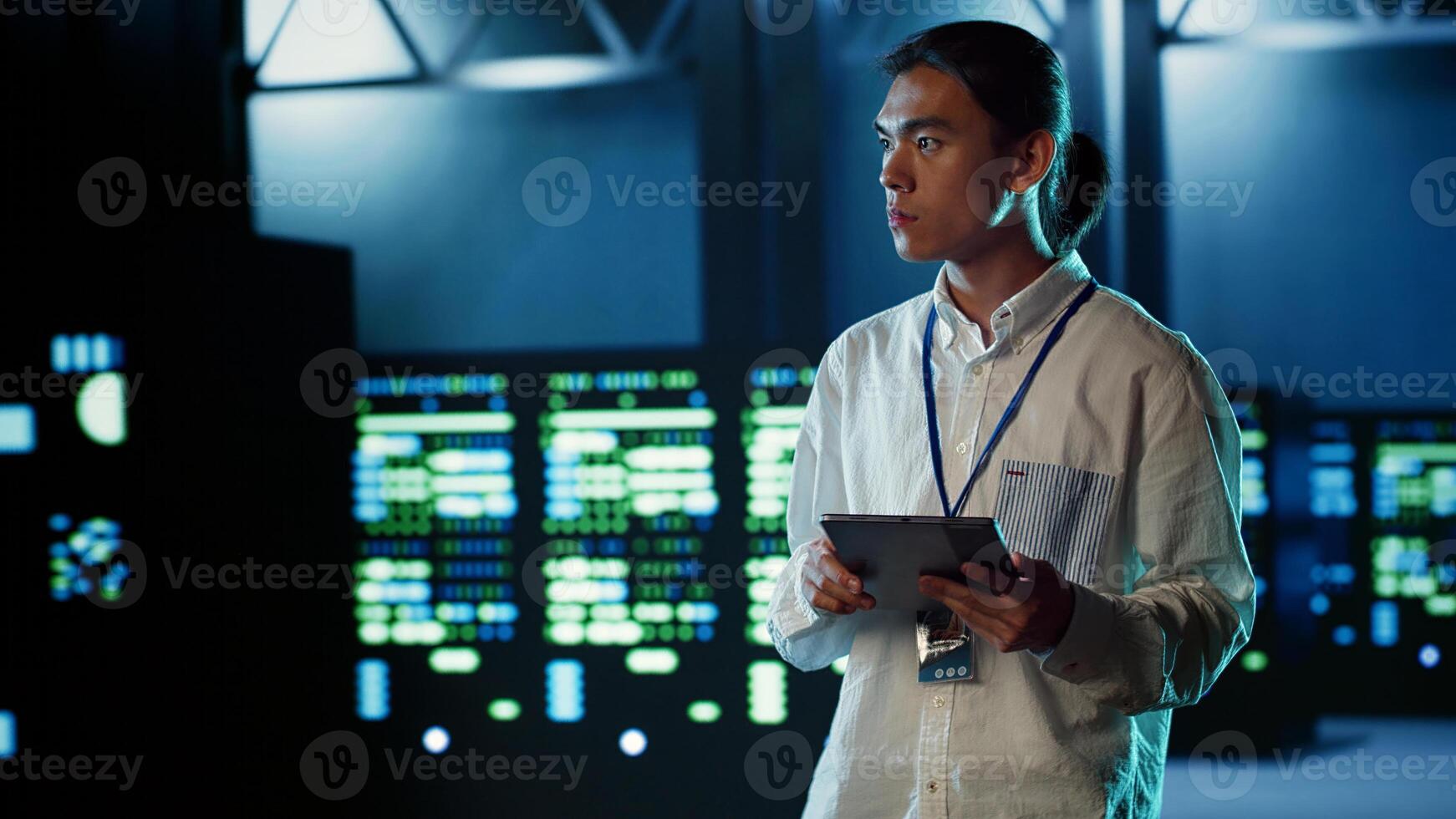 Qualified engineer strolling through data center server rows providing processing resources for different workloads. Proficient expert monitoring supercomputers tasked with solving complex operations Pro Photo