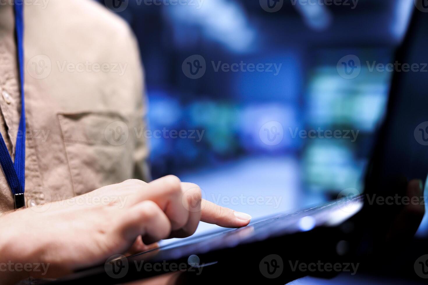 Expert repairman doing routine checkup in blockchain technology application specific integrated circuit supercomputer facility. Admin doing technical investigations in crypto mining farm, close up Pro Photo