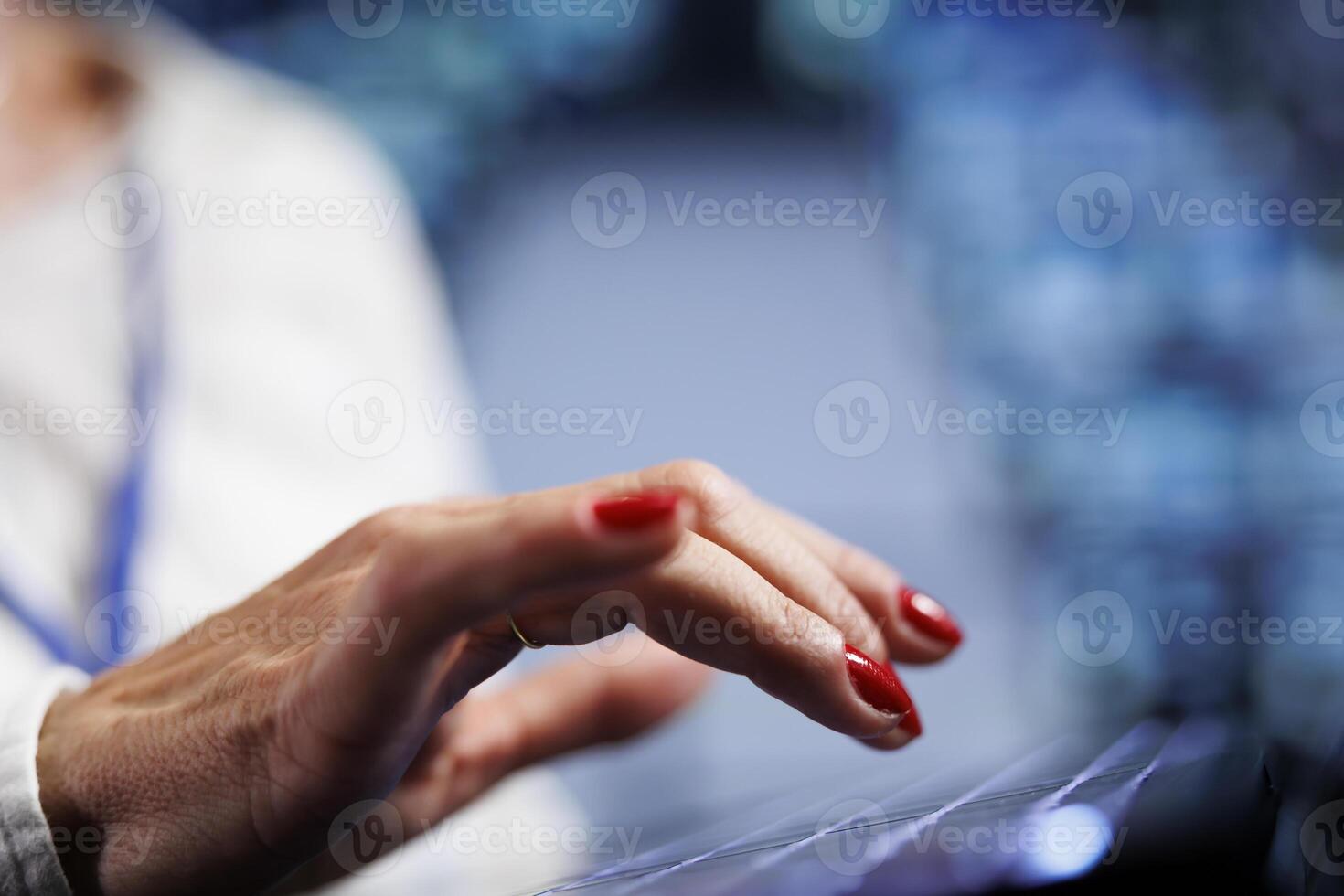 Aged employee working on laptop, setting up high bandwidth dedicated multiplayer gaming servers in high tech space to accommodate more traffic from worldwide locations and avoid low ping, close up Pro Photo