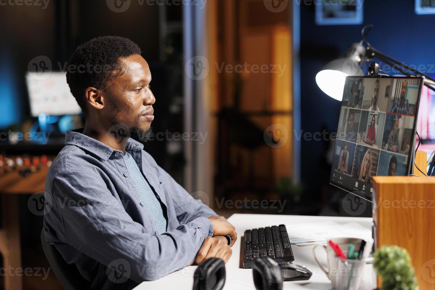 Startup team working together on videocall online, solving tasks remotely on internet network connection. Manager and employees meeting on videoconference meeting, asking questions. Pro Photo
