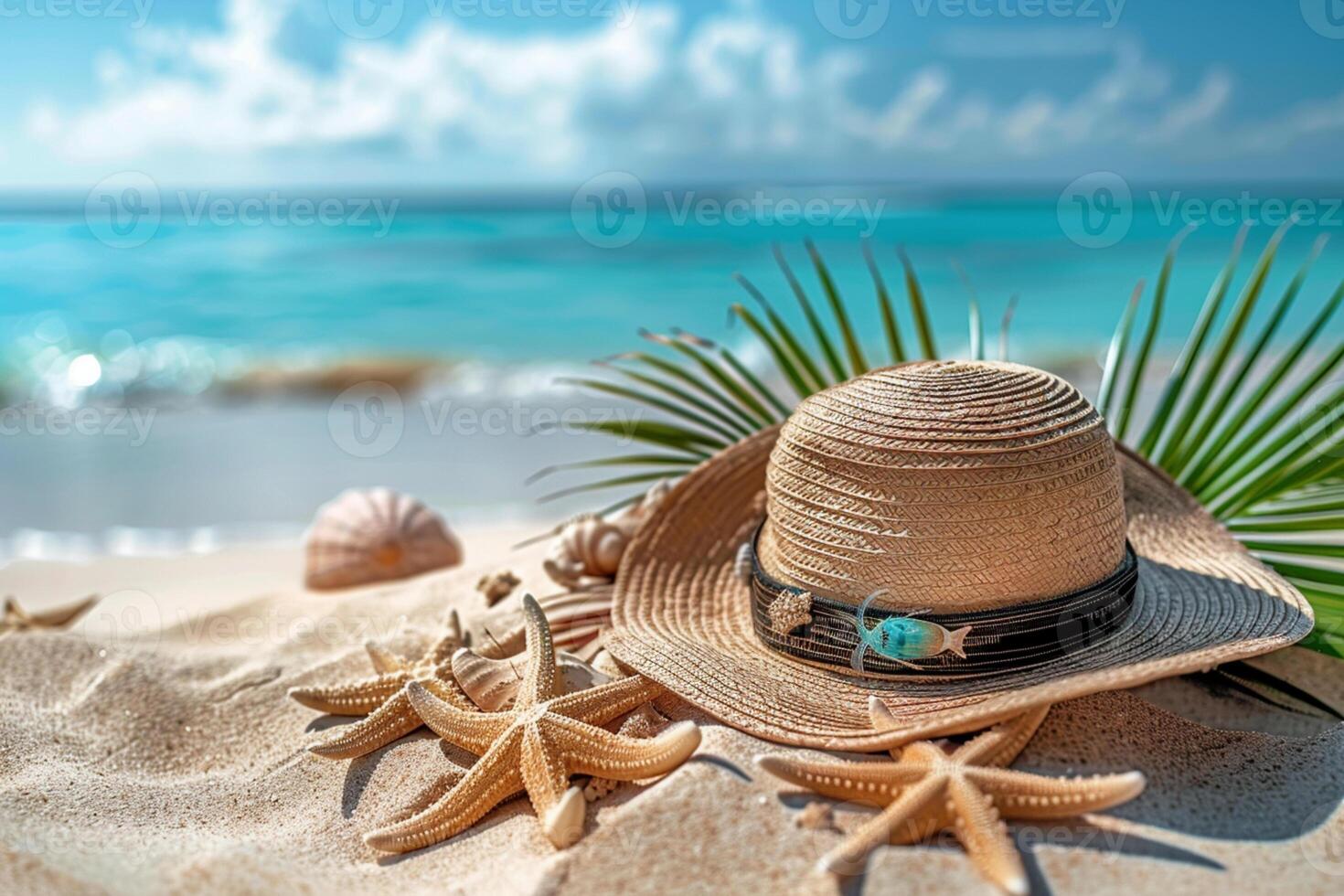 AI generated Starfish, Shell, Stones, Rope and Net Against a blurred ocean Background with Copy Space. Summer Holliday. Nautical, concept. Pro Photo