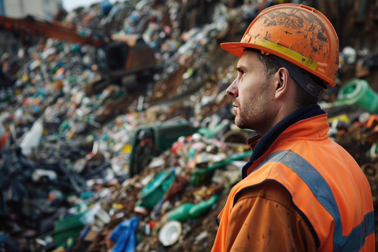 AI generated worker looking at an excavator unloading garbage at waste sorting plant Free Photo
