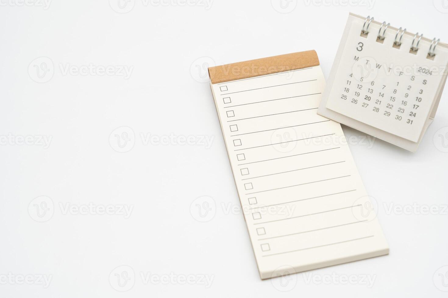 Blank Check list or Empty small notepad with checkbox and Simple desk calendar for MARCH 2024. Blank checklist for text. Copy Space. Pro Photo