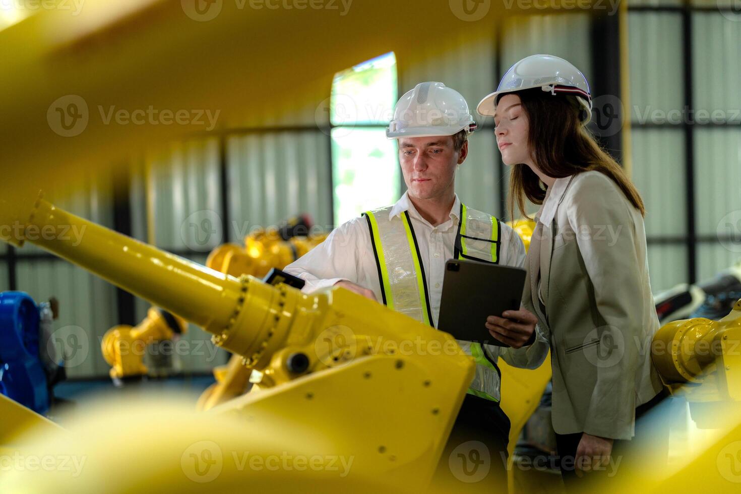 Factory engineers inspecting on machine with smart tablet. Worker works at machine robot arm. The welding machine with a remote system in an industrial factory. Artificial intelligence concept. Pro Photo