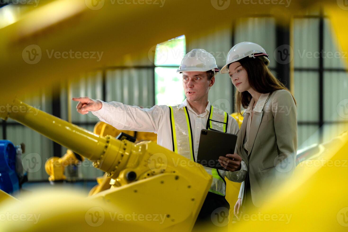 Factory engineers inspecting on machine with smart tablet. Worker works at machine robot arm. The welding machine with a remote system in an industrial factory. Artificial intelligence concept. Pro Photo