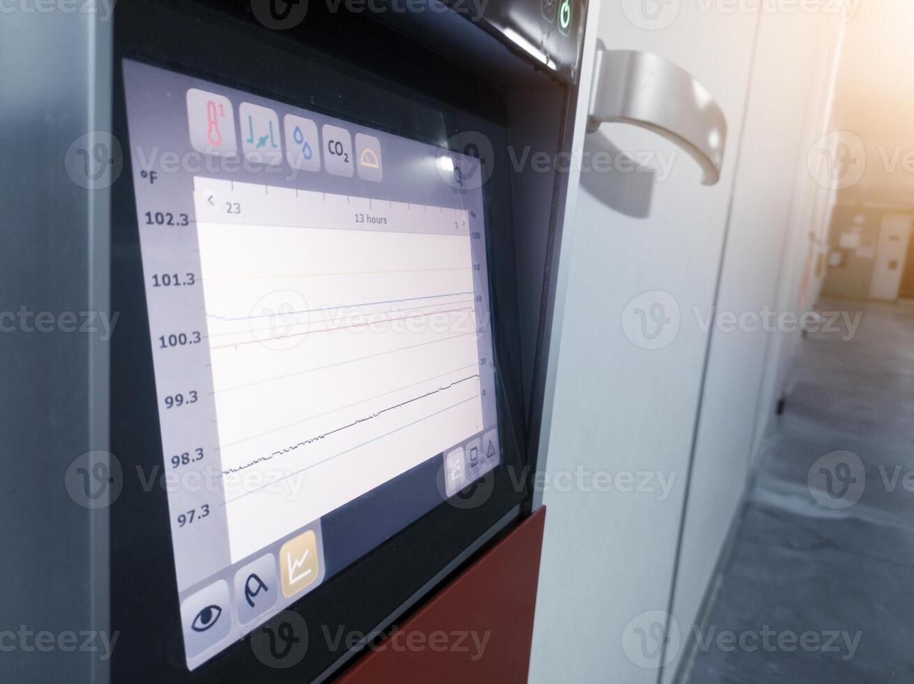 Close up the data graphics on display Technology of hatchery machine. Pro Photo