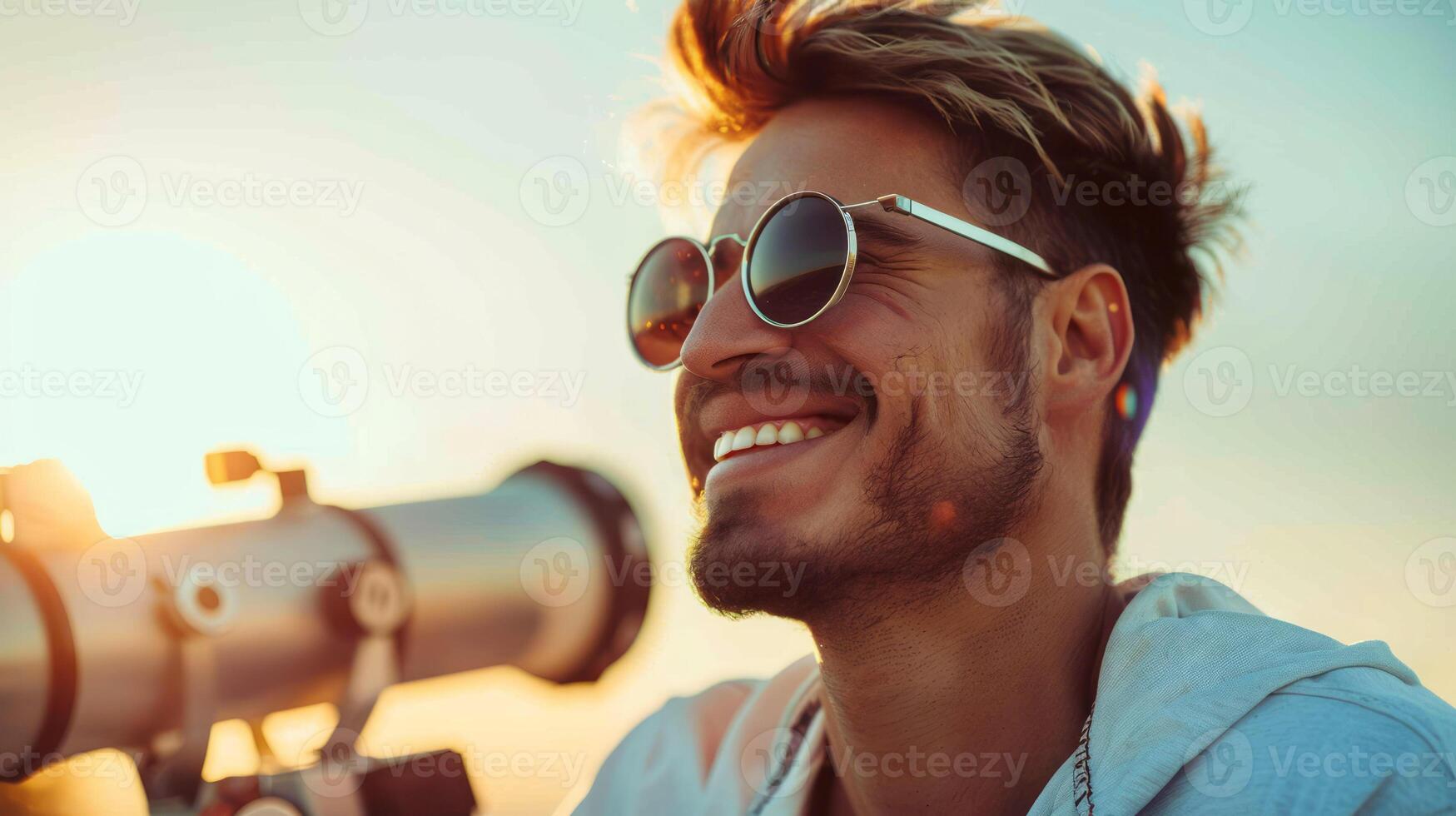 AI generated Smiling man with a telescope and eclipse viewing glasses Pro Photo