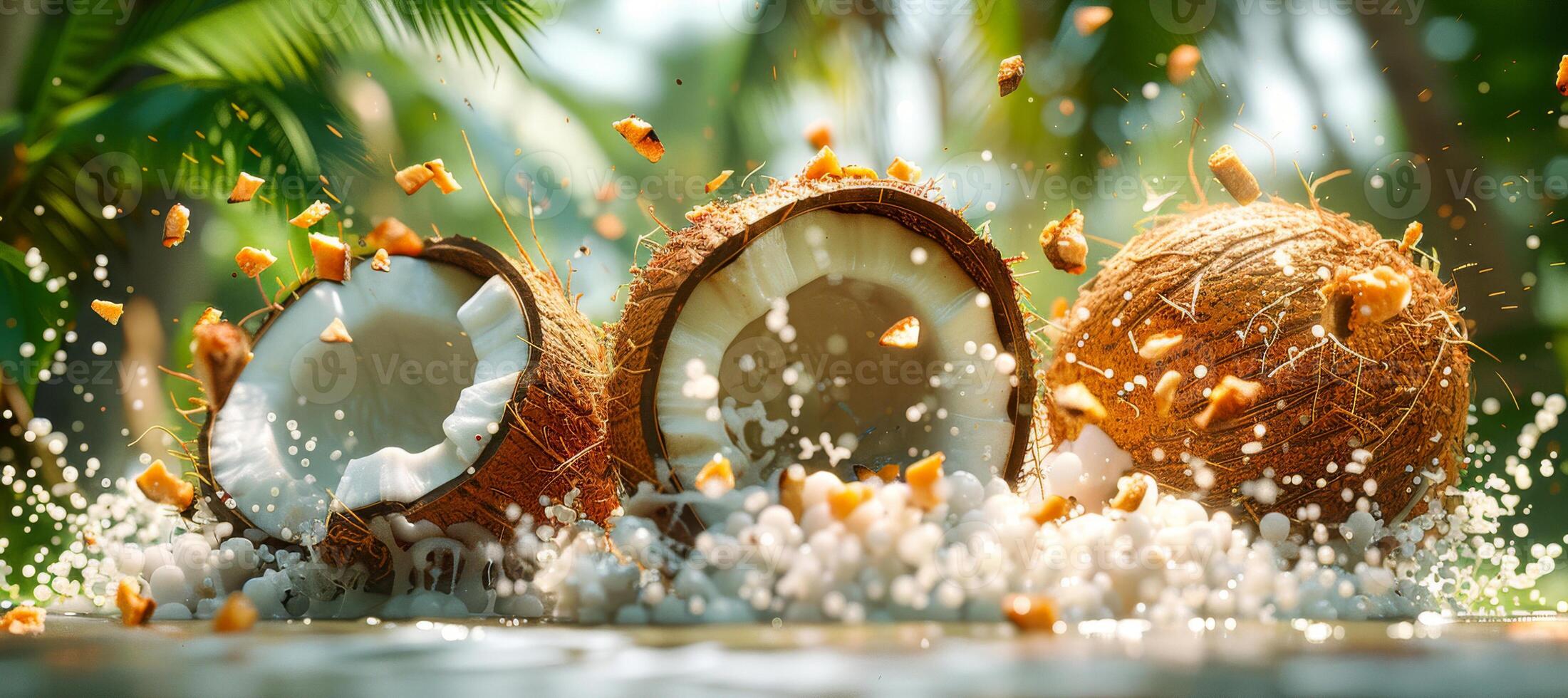 AI generated A bunch of coconuts is seen flying through the air as if they are exploding, showcasing dynamic motion and force Pro Photo