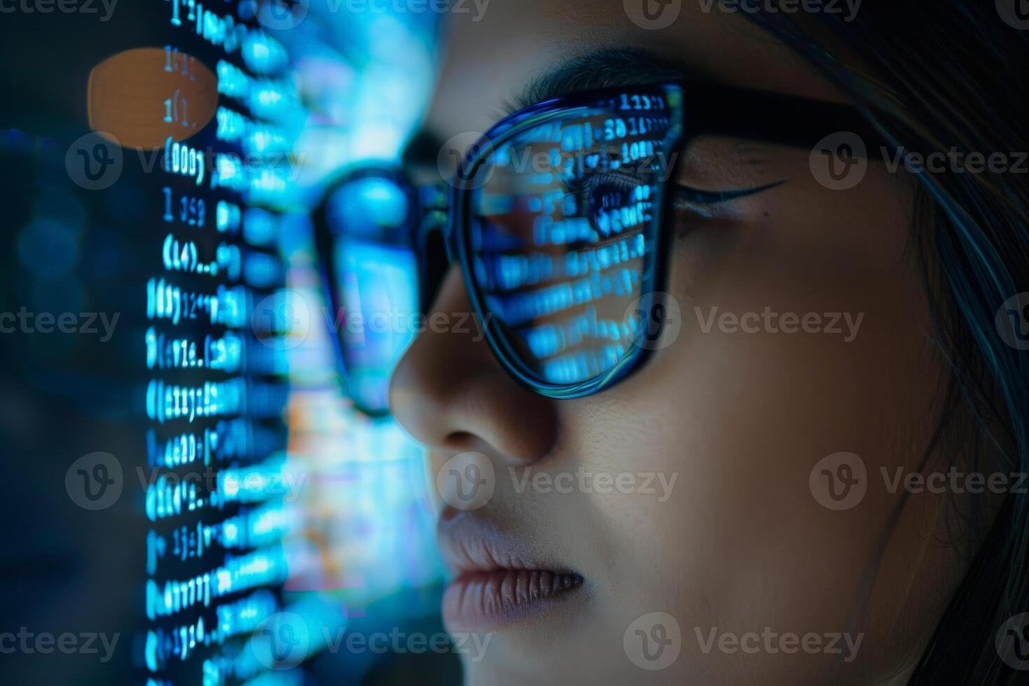 AI generated A woman with glasses studying a display of numbers and binary code, deep in thought and contemplation. Pro Photo