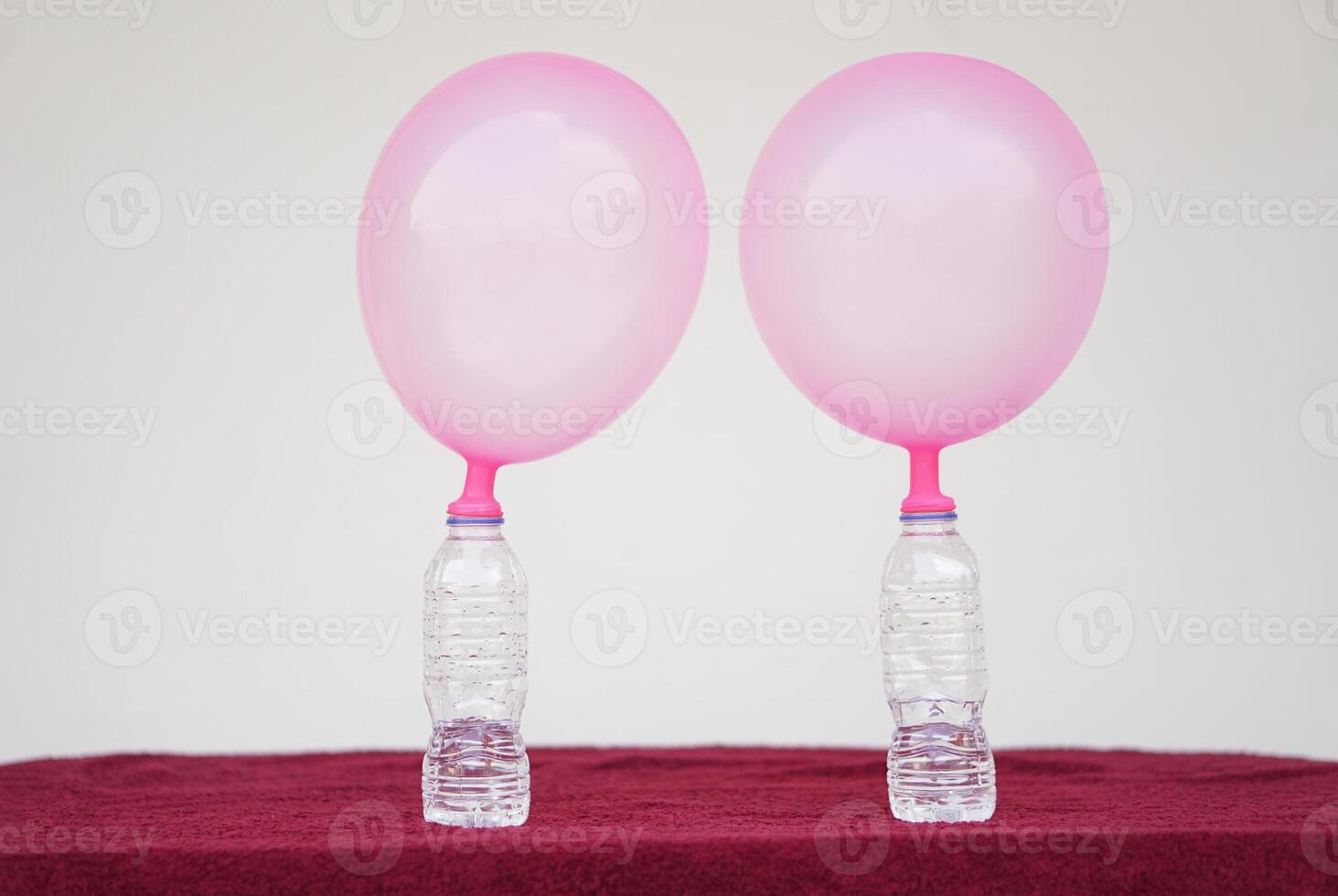 Inflated balloons on top of transparent test bottles. Concept, science experiment about reaction of chemical substance, vinegar and baking soda that cause balloon inflat. Last step of experiment Pro Photo
