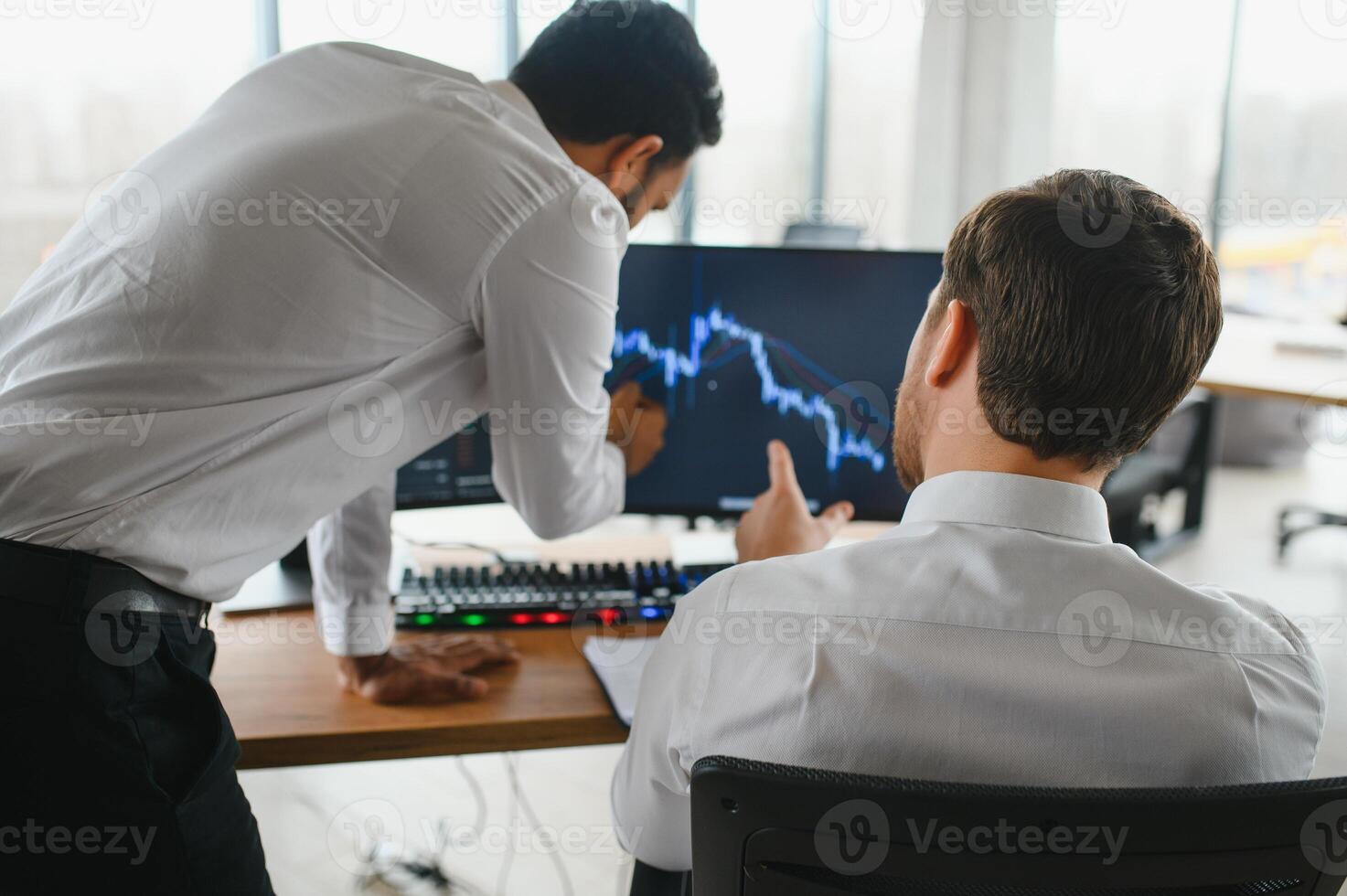 Two men traders sitting at desk at office together looking at data analysis discussing brainstorming successful strategy inspired teamwork concept close-up Pro Photo
