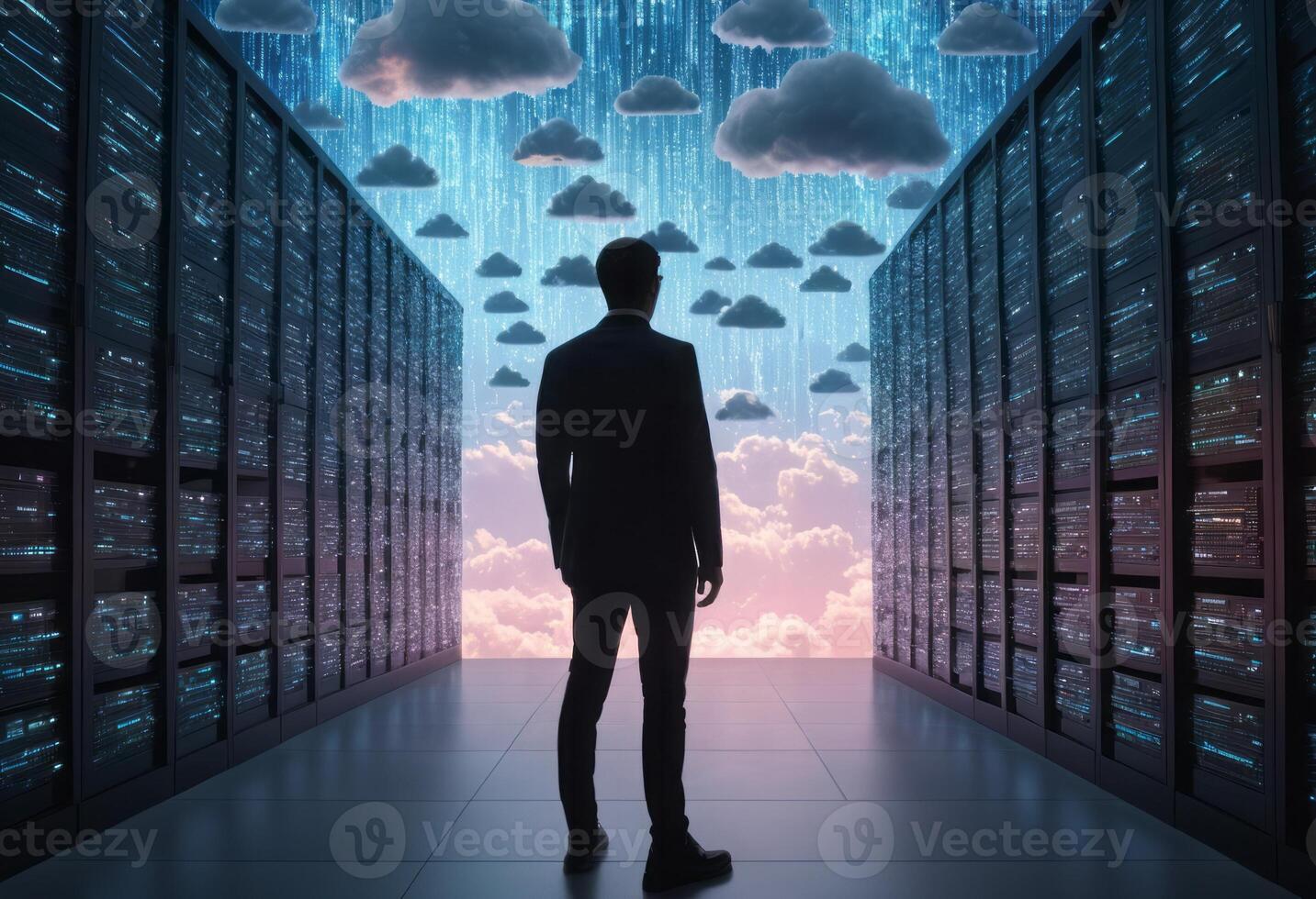 AI Generated Silhouette of a person stands in a futuristic data center. Clouds and servers symbolize connectivity and data flow. Pro Photo
