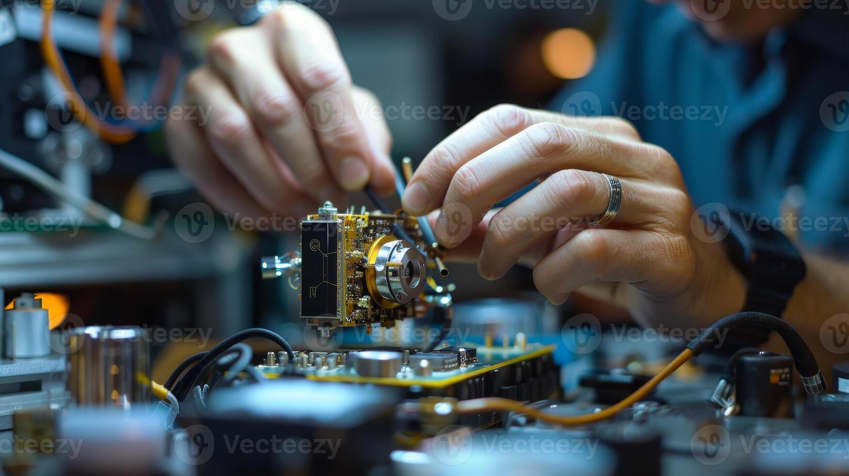 AI generated Focused technician with expert hands assembling intricate electronic parts on a circuit board, depicting high precision and skill. Pro Photo
