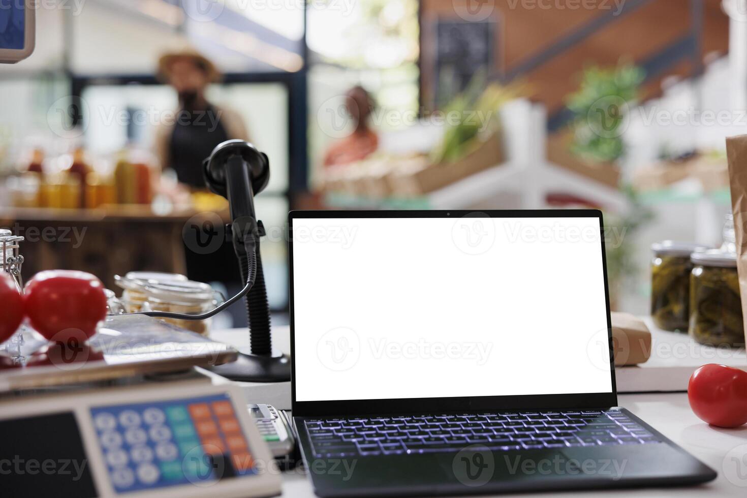 Black laptop with blank white screen placed on a counter next to a measuring weight scale machine in environmentally friendly store. Wireless computer displaying isolated chromakey mockup template. Pro Photo