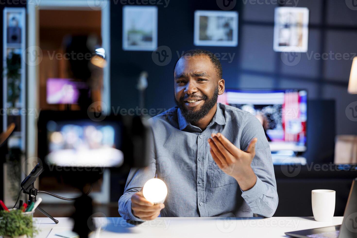 Content creator discussing with fans best ways to enhance home automation, showcasing latest intelligent light bulb to audience. Cheerful tech enthusiast demonstrating Wi-Fi-based IoT technology Pro Photo