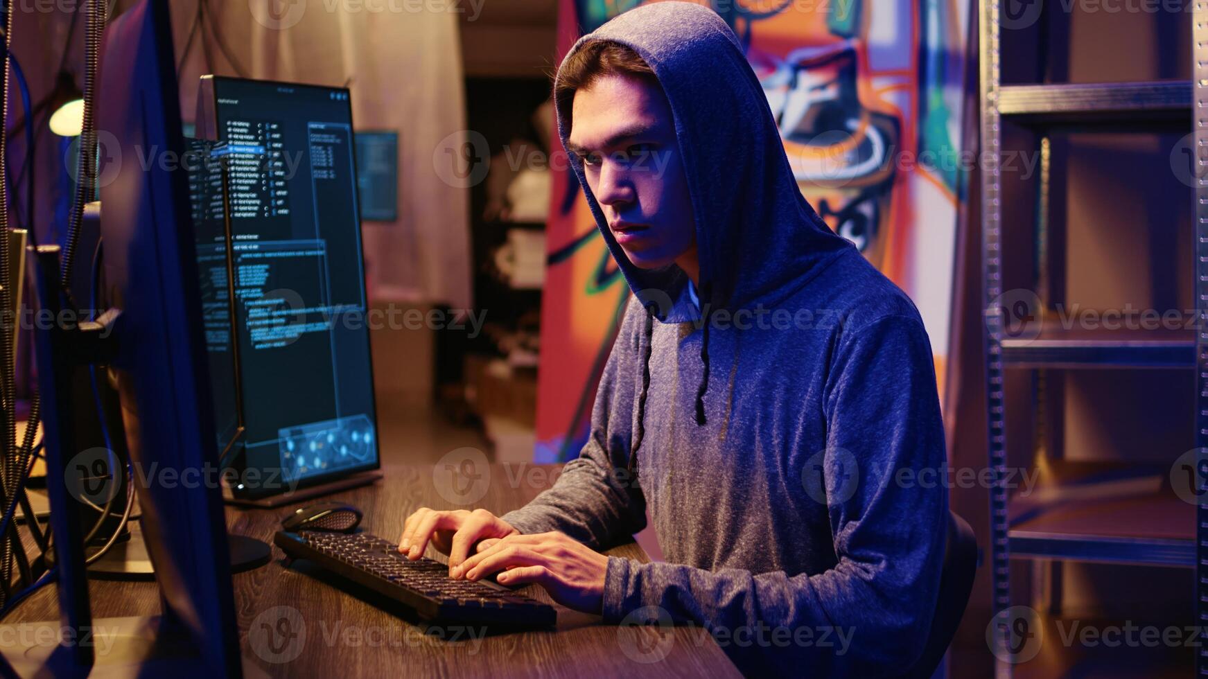 Lone wolf hacker in secret hideout trying to hide his online activity after stealing data from victims using computer virus, trying to avoid being detected, extreme close up shot Pro Photo