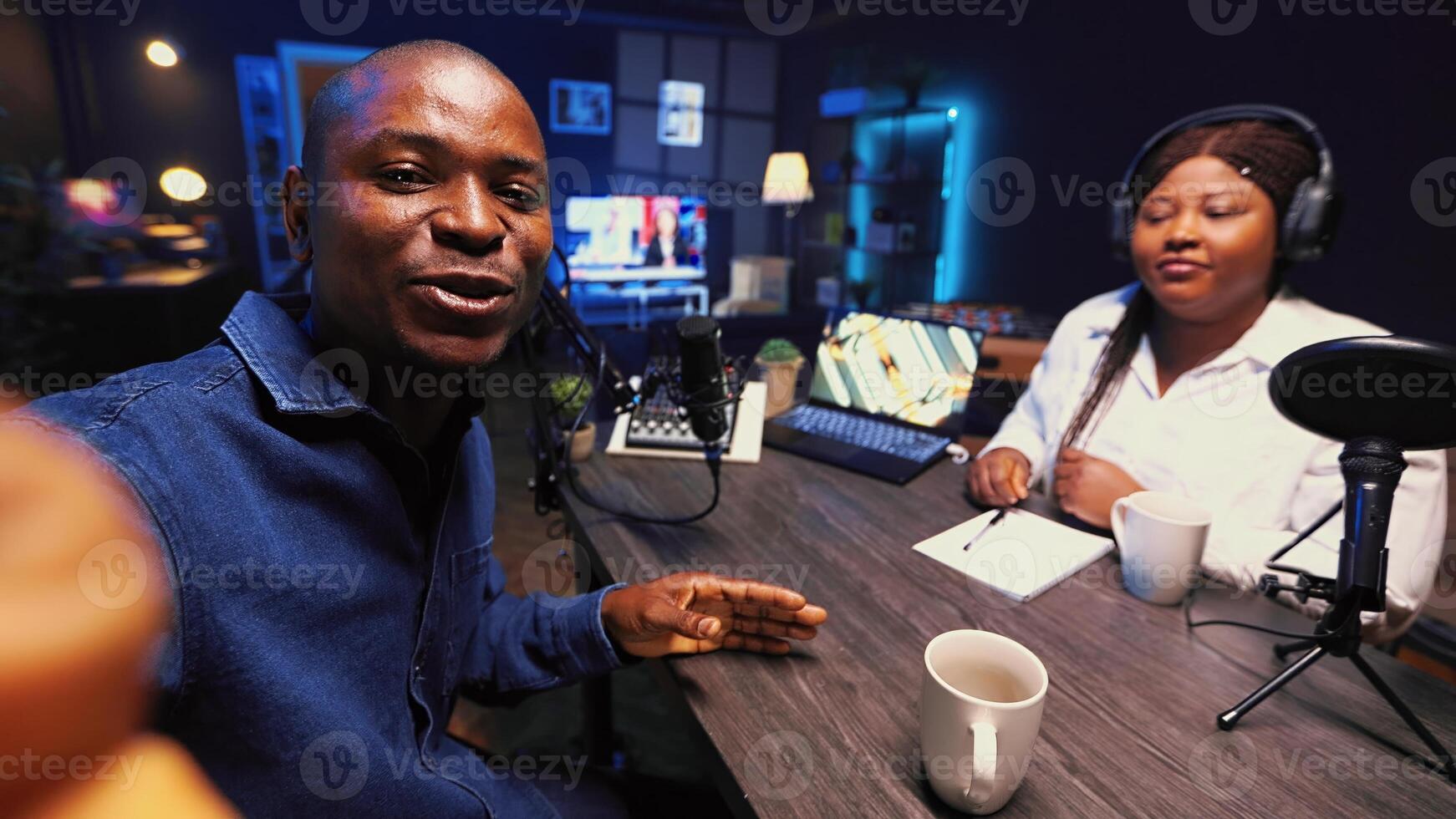 Man recording podcast using selfie camera on cellphone and high tech microphones to interview guest, ensuring flawless video and sound quality for audience watching at home, POV shot Pro Photo