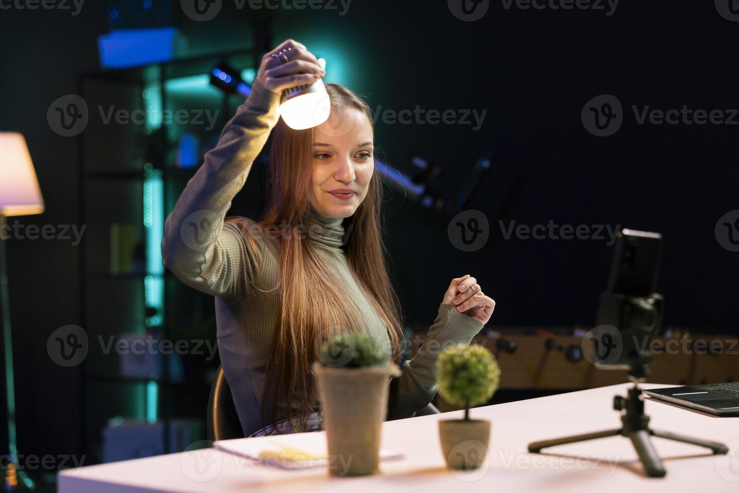 Upbeat influencer in neon lit studio filming review of light bulb able to change into different colors. Smiling gen Z tech expert presents smart home automation technology controlled by voice commands Pro Photo