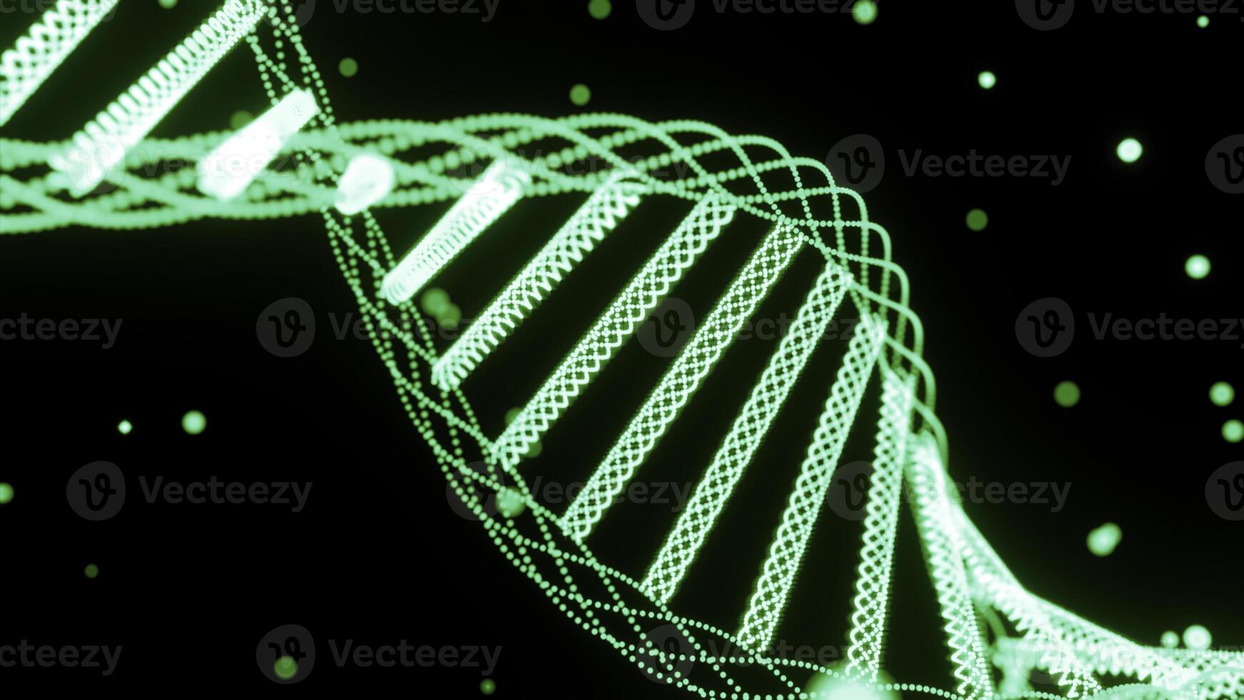 Animation of rotating DNA strands. Design. Green spinning abstract dna spiral rotating on a black background with tiny particles. Pro Photo