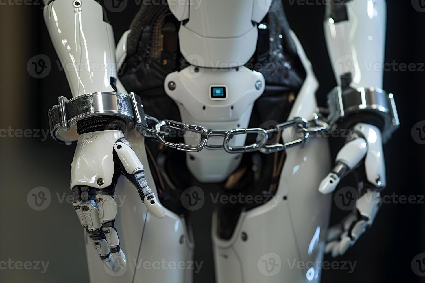 AI Generated robot hands shackled in chains for the concept of constraints and regulation of artificial intelligence Pro Photo