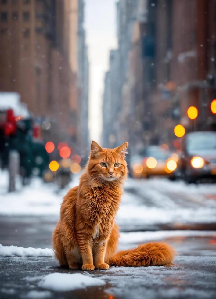 AI generated Ginger cat sitting on snow and looking at camera. Winter background. ai generative Free Photo