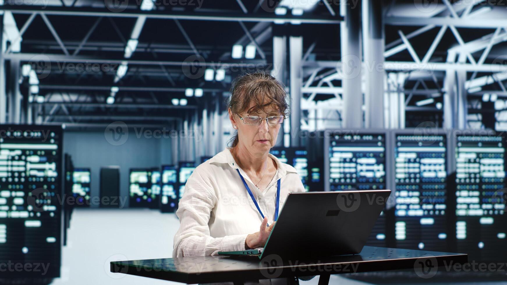 Certified employee working in server hub housing GPU dedicated supercomputers that can process AI tasks with high efficiency, adjusting rigs used for machine learning acting up Pro Photo