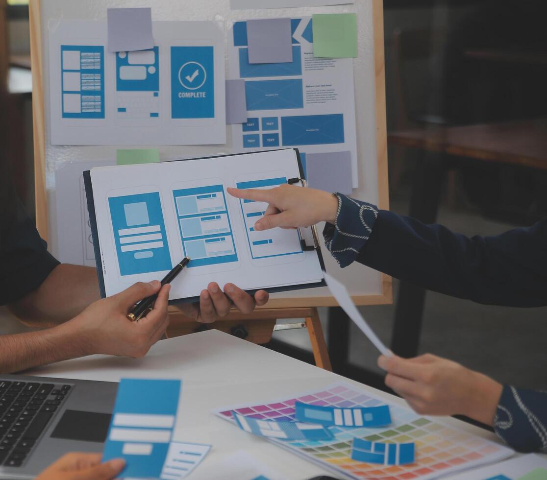Close up ux developer and ui designer use augmented reality brainstorming about mobile app interface wireframe design on desk at modern office.Creative digital development agency Free Photo