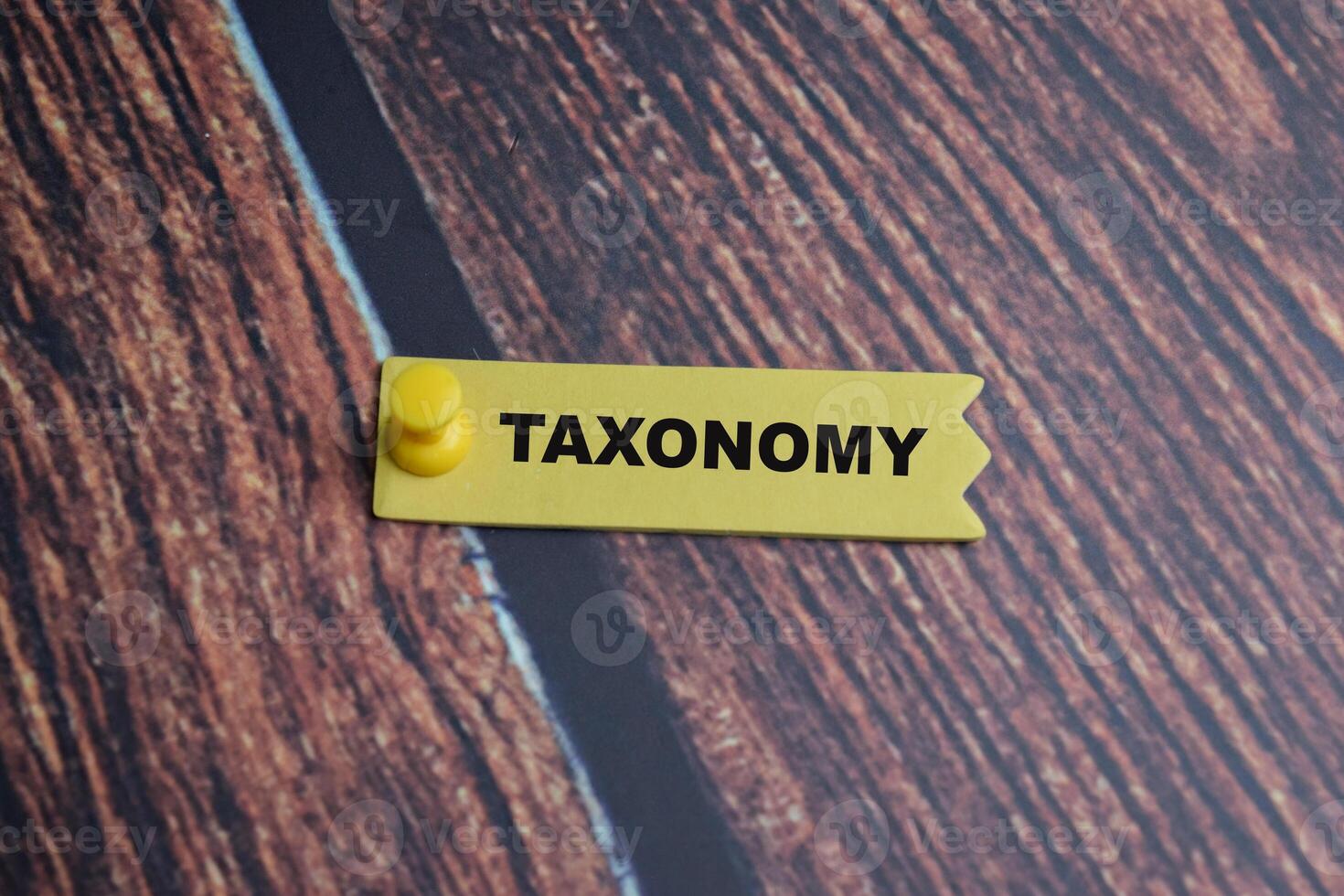Concept of Taxonomy write on sticky notes isolated on Wooden Table. Pro Photo