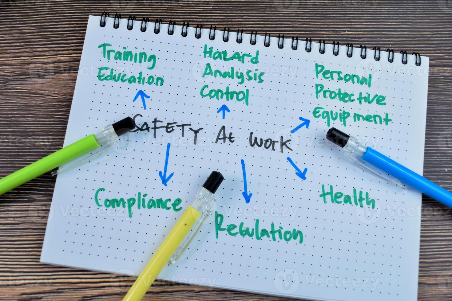 Concept of Safety at Work write on book with keywords isolated on Wooden Table. Pro Photo