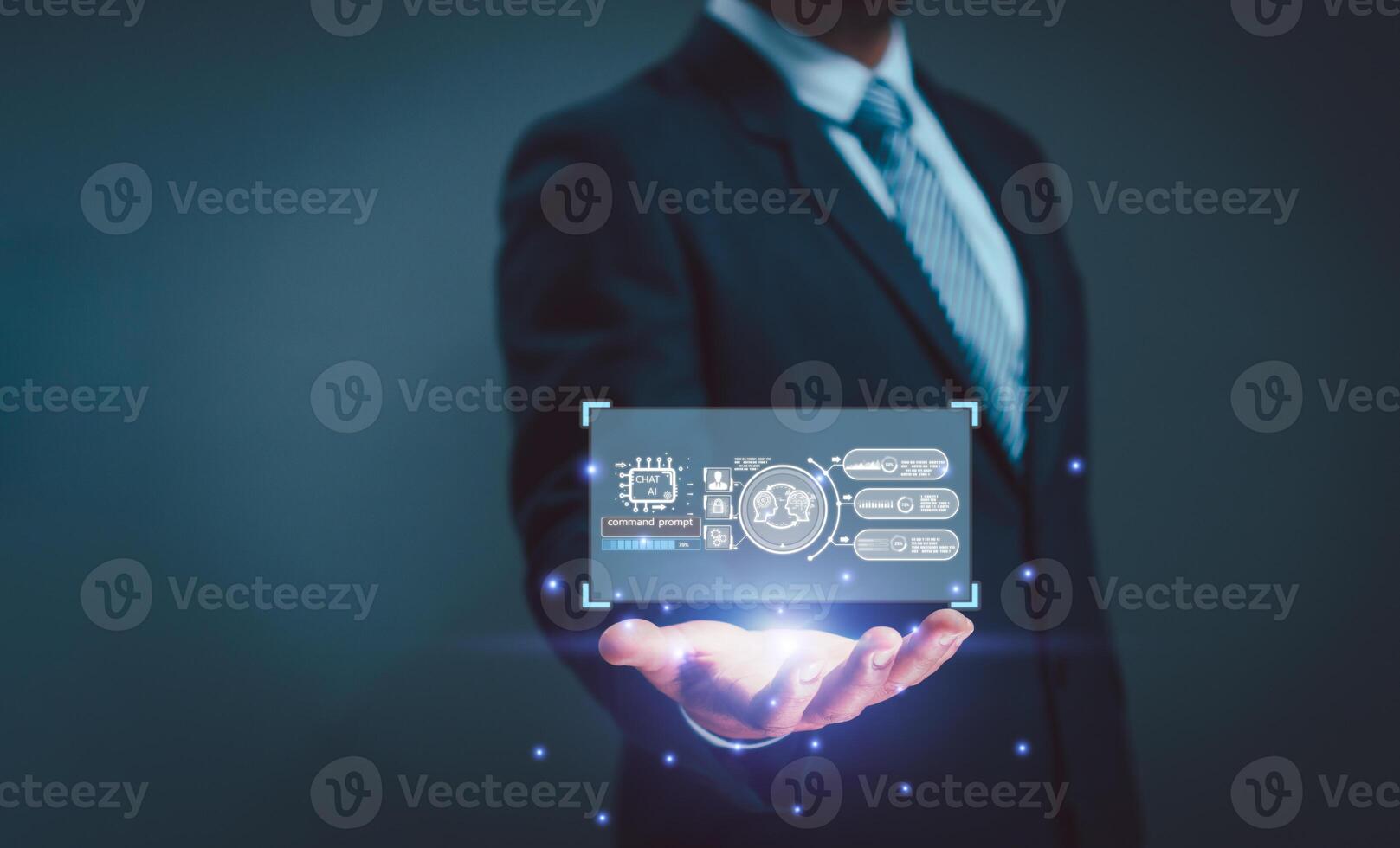 Chat with Ai tech, Artificial Intelligence. businessman hand show virtual screen Internet connect user Innovation technology brain smart robot. Command set to analyze data and commercial processing. Pro Photo