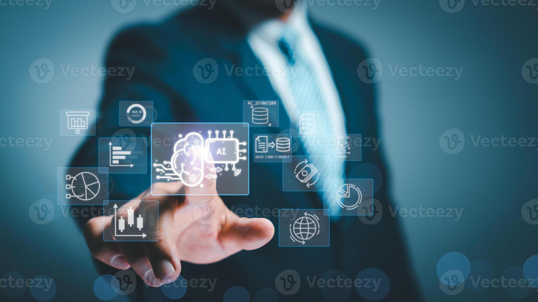 command Ai tech, Artificial Intelligence. businessman hand touch virtual screen Internet connect user Innovation technology brain smart robot. Command set to analyze data and commercial processing. Pro Photo