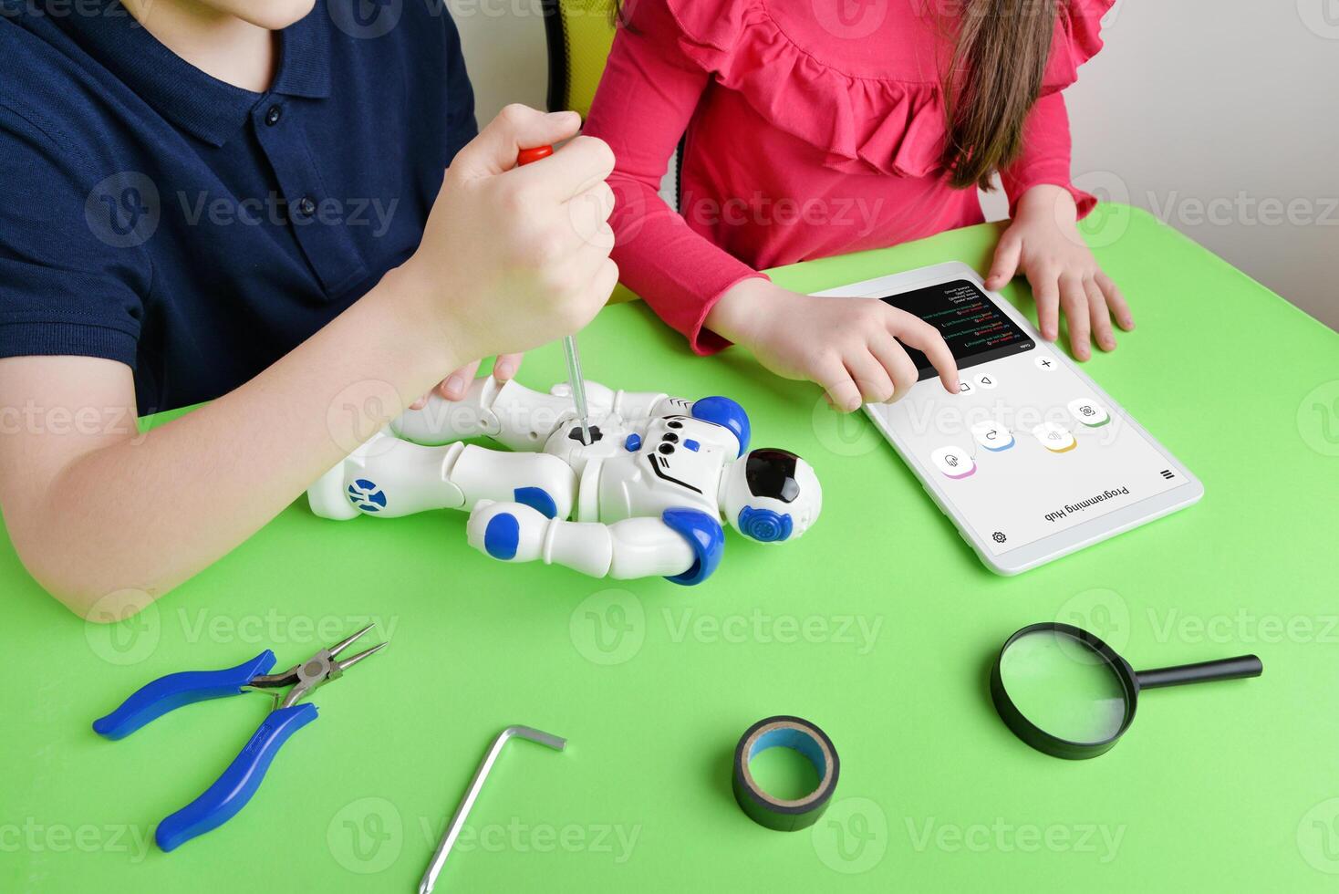 Children's hands assemble robot on workbench, screwing parts while reviewing programming code on tablet. Concept of learning and hands-on education Pro Photo