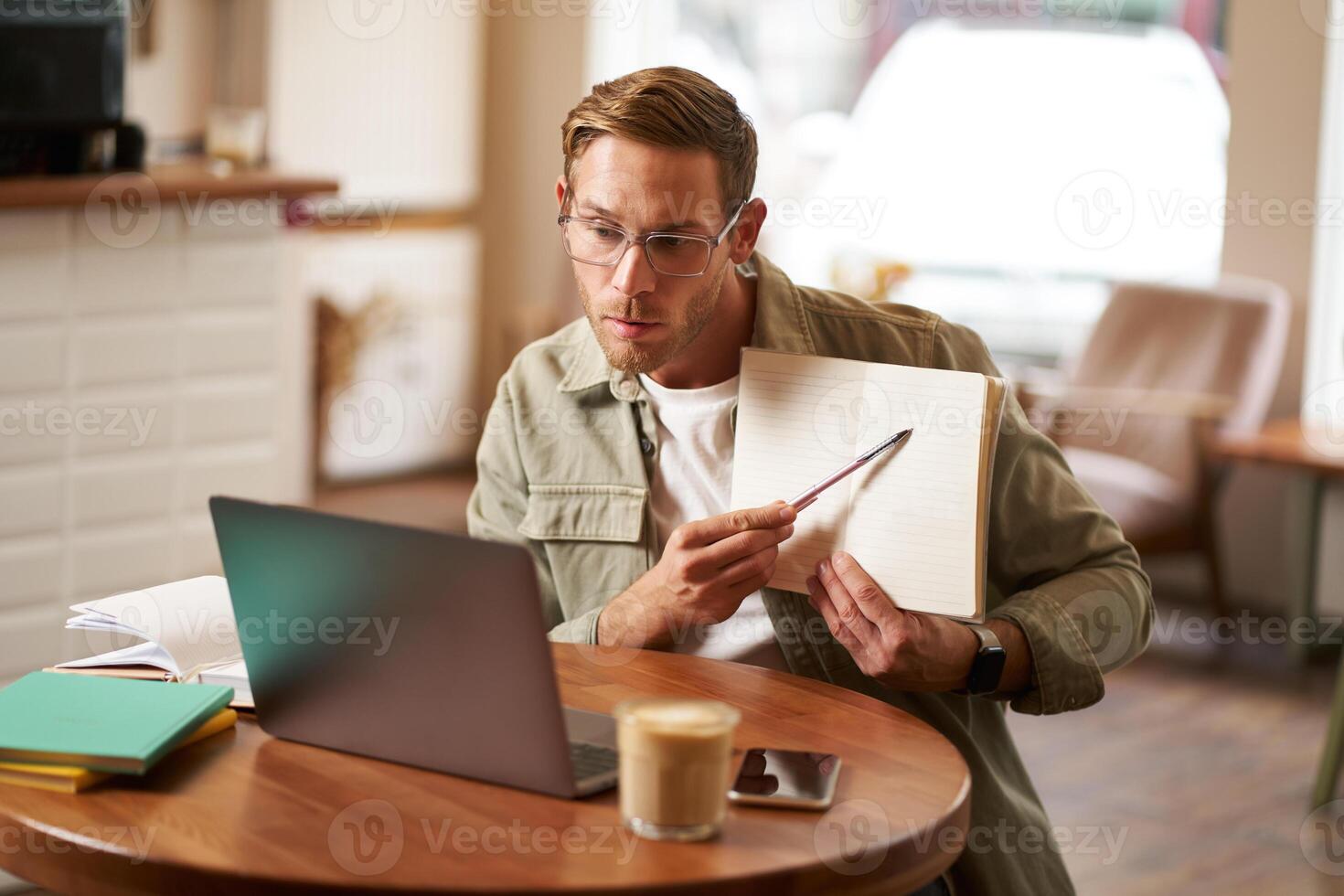 Portrait of handsome man in glasses, working remotely from empty cafe, showing example in his notebook, tutoring, using laptop to meet with student online Pro Photo