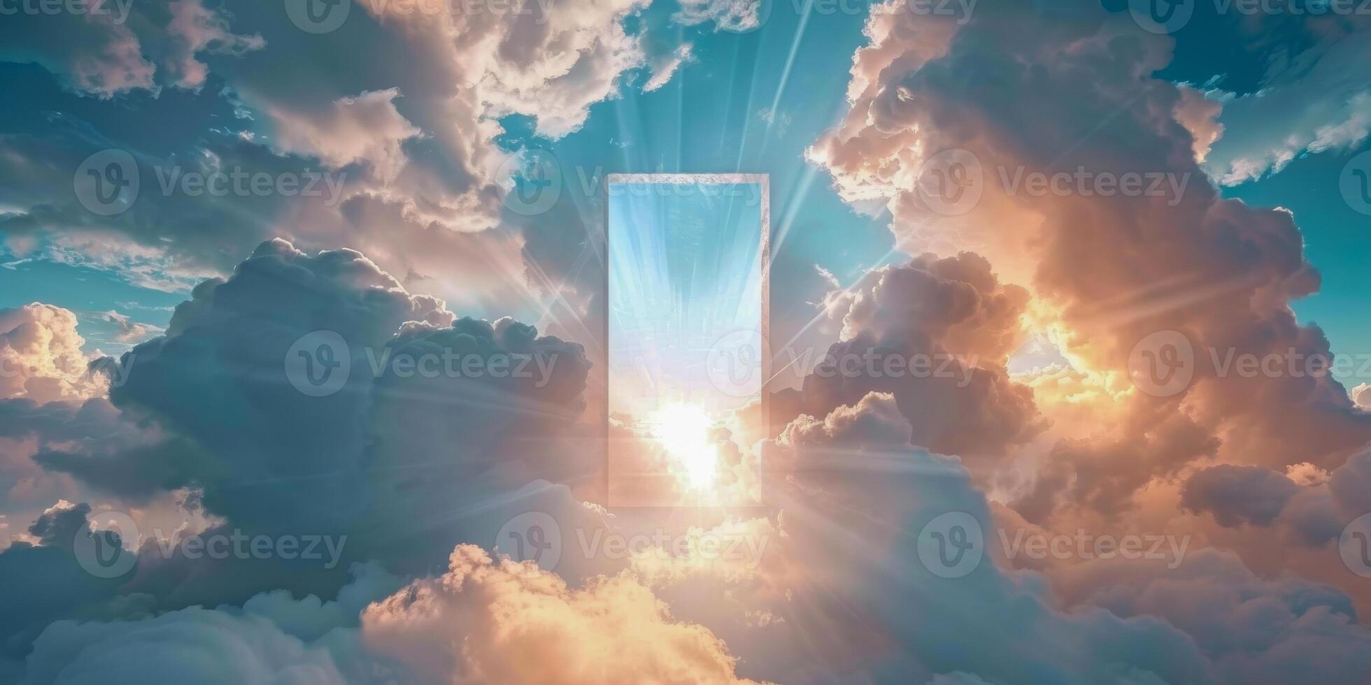 AI generated An image capturing clouds with a beam of light emanating from a mystical-looking doorway suspended in the sky Pro Photo