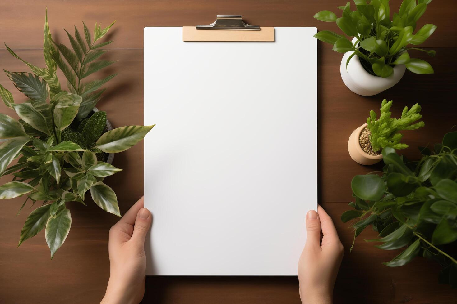 A person holding a clipboard with a blank sheet of paper on it, ready to jot down notes or instructions. photo
