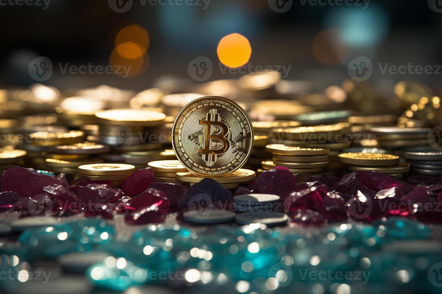 A shiny bitcoin placed on a stack of gleaming gold coins, symbolizing digital currencys value against traditional wealth. Pro Photo