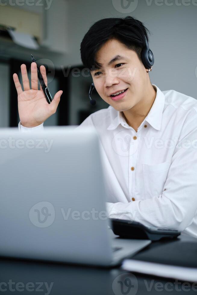 Businessman discuss with partners by call. Male technical support agent trying to explain something to a client while working on laptop at call center. Pro Photo