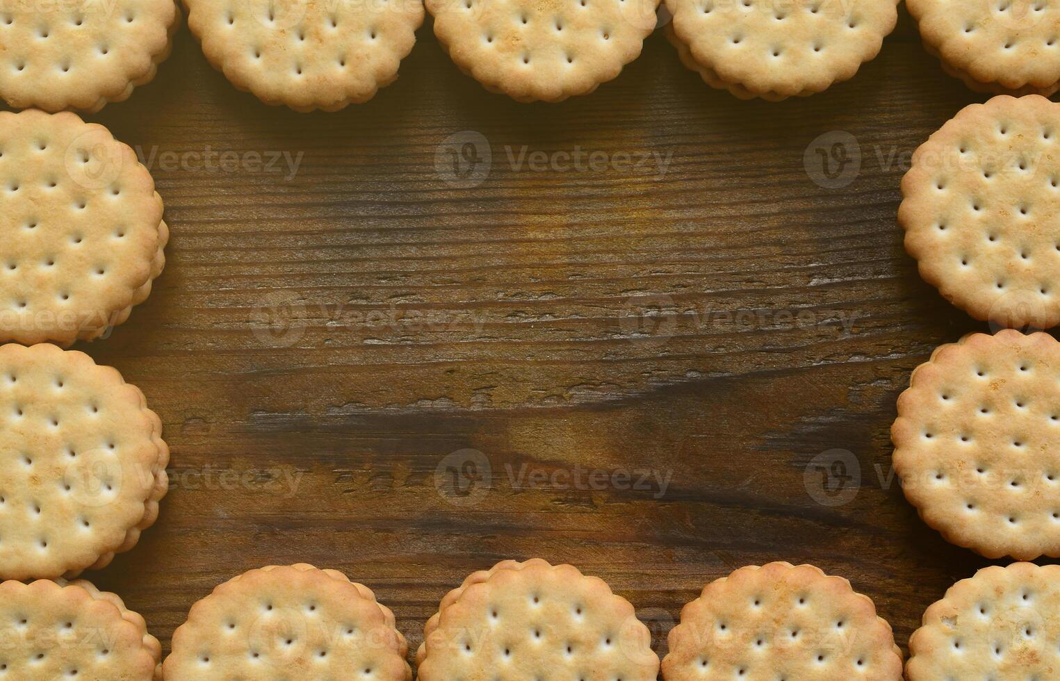 A frame of round cookie sandwich with coconut filling on a dark brown wooden surface. Unusual use of cookies as a frame. Image with copy space Pro Photo