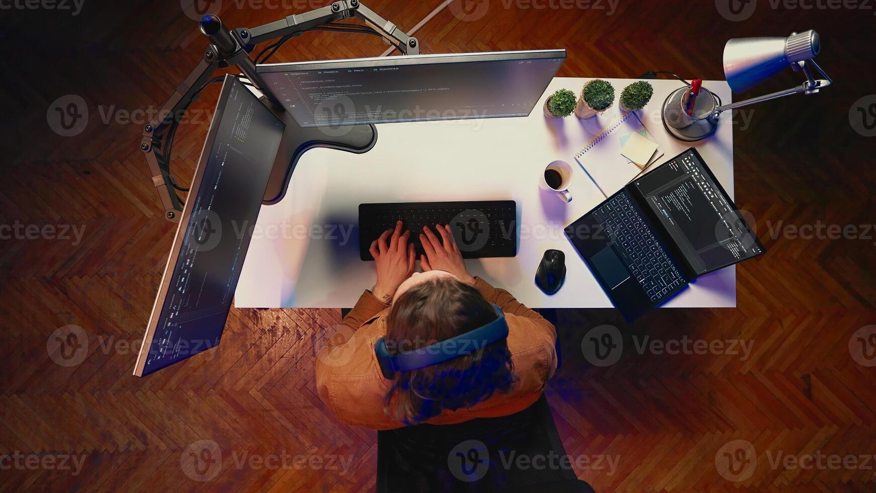 Top down view of fatigued software technician working overnight at home, taking break from coding to stretch at desk chair. Overworked IT admin feeling exhausted, pausing tasks to rest, aerial shot Pro Photo