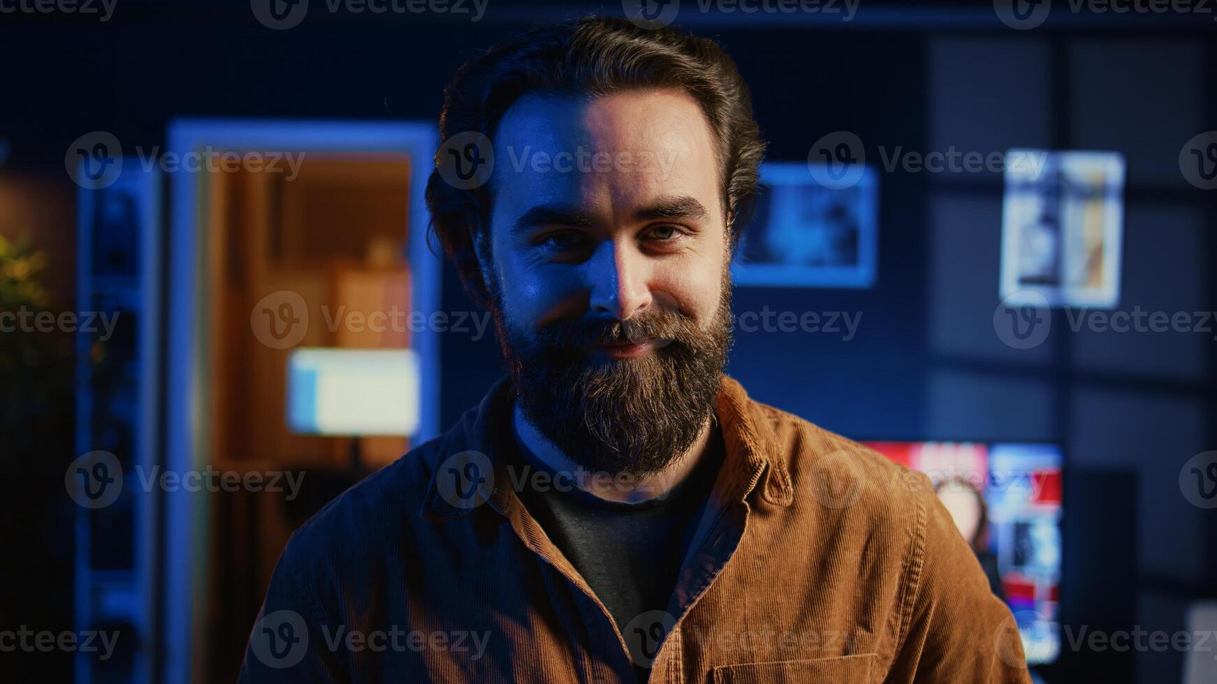 Portrait of smiling developer writing complex binary code scripts on laptop terminal. Cheerful remote IT employee standing in home office, using programming to safeguard consumer data, camera B Pro Photo